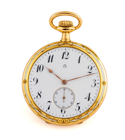 Very fine,18K yellow gold, open-face, keyless-winding, roundshaped,pre-Art Deco pocket watch with hinged case-back and subsidiary seconds at 6, Bezel and caseback with enamel decoration, white, blue and green translucent colours.