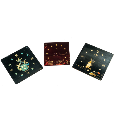 OMEGA, A SET OF THREE BRASS, LACQUER DESK CLOCK DIALS BY JEAN-PIERRE MATTHEY