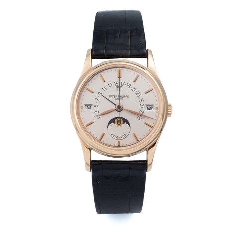 A fine and rare, 18k pink gold, self winding retrograde perpetual calendar wristwatch