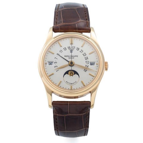 A very fine and rare, 18k yellow gold, self winding retrograde perpetual calendar wristwatch with moonphase