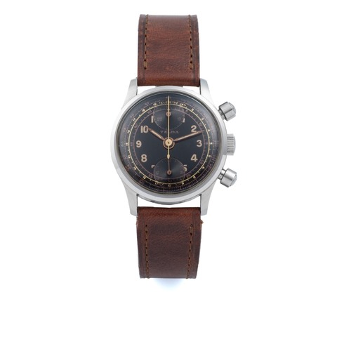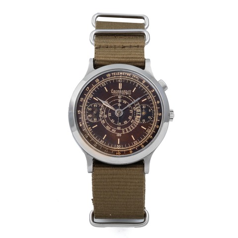 A fine, large and attractive, stainless steel, manual wind waterproof chronograph wristwatch with two-tone dialGrading System: AA