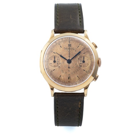 A fine, rare and attractive, 18k yellow gold, manual wind single-button chronograph wristwatch with enamel dial and multicoloured scales
