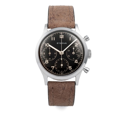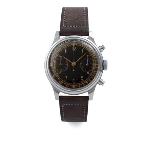 A fine, large, rare, well-preserved, stainless steel, manual wind waterproof chronograph wristwatch with black dialGrading System: AA