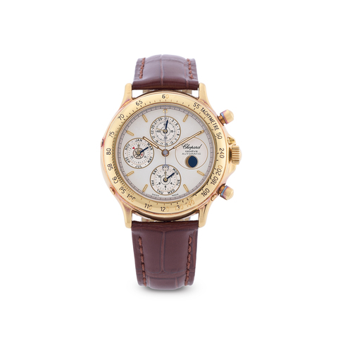 A very fine and classic, 18k yellow gold self-winding chronograph wristwatch with perpetual calendar, moonphases, leap year indication and sapphire crystal caseback.