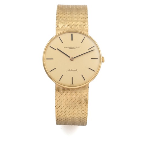 A fine 18k yellow gold thin self-winding wristwatch with champagne dial with an integrated yellow gold ap bracelet