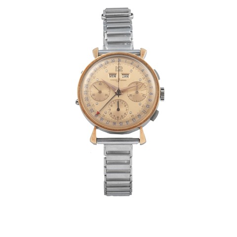 An oustanding and very rare stainless steel and rose gold manual winding chronograph wristwatch with a beautiful salmon dial, 3 registers, day, date and month