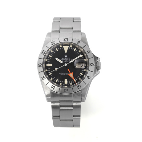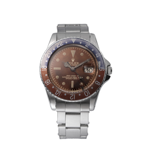 An exceptional and rare rolex gmt-master reference 1675, featuring a beautiful tropical chapter ring dial that has aged to a rich and even chocolate tone, the glossy surface shows an attractive “spider” pattern, the result of natural aging of the original lacquer, the luminous hour markers and matching hands are in radium, maintaining their warm vintage hue