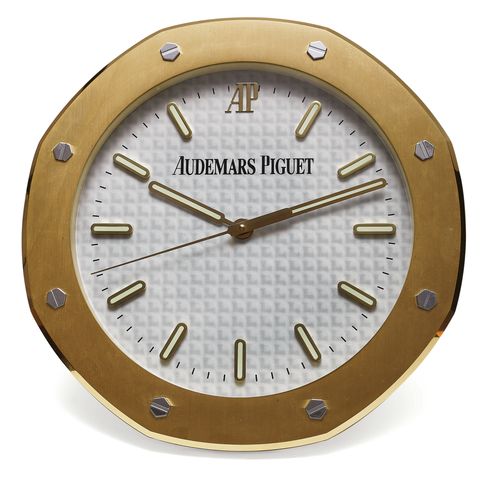 Octagonal, brushed gilt, eight polished steel screw heads. White with photographically reproduced clous- de- Paris decoration, applied metal and green painted baton indexes, outer minute track. Metal and green painted baton hands with metal second hand. With quartz standardization.Grading System: AA