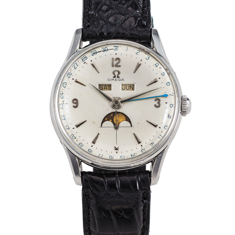 Three-body, polished and brushed, concave lugs, inclined bezel, correctors on the band, snap-on case back. Matte silver with applied steel faceted dart indexes, subsidiary seconds dial, outer graduation for the days of the month in black Arabic numerals, apertures for the days of the week, the months and the moon phases. Gold baton hands, blue arrow hand for the date. Cal. 27DL PC, copper colored, 17 jewels, straight-line lever escapement, monometallic balance, shock absorber, self-compensating flat balance spring, index regulator.Grading System: AA