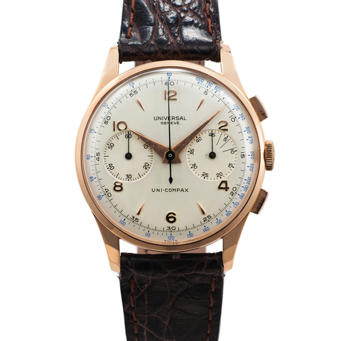 Three-body, polished, inclined bezel, concave lugs, snap-on case back. Silver with applied Arabic numerals and dart indexes, outer 5-minute/seconds Arabic divisions and tachometer graduation to 1000 UPH, subsidiary guilloche dials for the seconds and 45-minute registers. Pink gold dauphine hands. Cal. 285, brass-plated, straight-line lever escapement, monometallic balance, Breguet balance spring, index regulator.