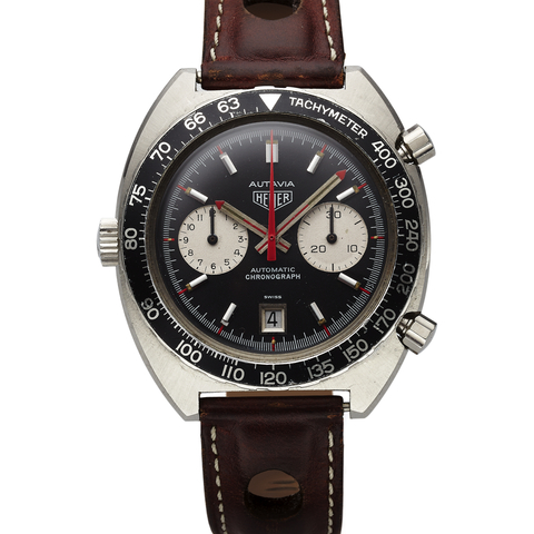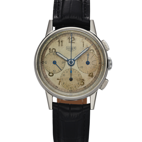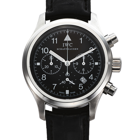 Two-body, polished and brushed, screwed-down case back, flat bezel, winding crown at 9. Black with applied luminous baton indexes, outer 1/5th seconds track and tachometer scale to 200 UPH, subsidiary dials for the 30-minute and 12-hour registers, aperture for the date at 6. Luminous white and black baton hands. Cal. 15, gilt brass, 17 jewels, straight-line lever escapement, monometallic balance, shock absorber, self-compensating flat balance spring.