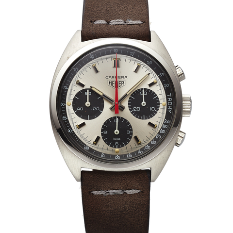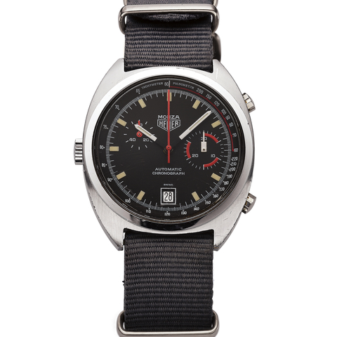 Two-body, polished and brushed, screwed-down case back, black bezel with tachometer graduation to 400 UPH, winding crown at 9. Bicolor black and silver with applied luminous steel baton indexes and red markers, outer 1/5th seconds track, subsidiary dials for the 30-minute and 12-hour registers, aperture for the date at 6. Luminous steel and red baton hands. Cal. 11, rhodium-plated, 17 jewels, straight-line lever escapement, monometallic balance, shock absorber, self-compensating flat balance spring.