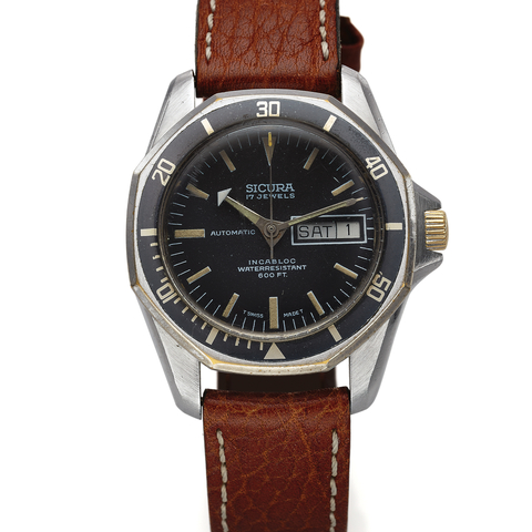 Three-body, polished, screwed-down steel case back with logo, octagonal graduated bidirectional revolving black bezel for the decompression times, protected winding crown. Black with luminous baton indexes, outer minute/seconds track, aperture for the date and the day of the week. Luminous steel arrow hour and baton minute hands. Cal. 1239-21, copper color, 17 jewels, straight-line lever escapement, shock absorber, self-compensating flat balance spring.