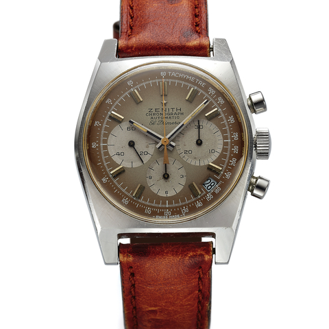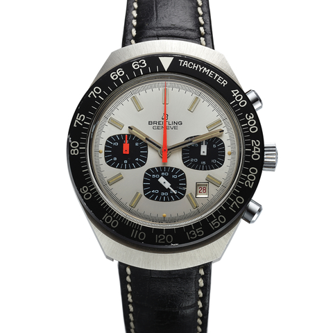 Three-body, polished, glazed reverse, stepped concave bezel, round-button pushers. Satin silvered with black Arabic numerals, outer minutes, subsidiary seconds, 12 hours register, chequered subsidiary 30 minute register, aperture for the day and date, raised outer matt-black 60 second scale. Black baton hands, orange chronograph hand with yellow vernier scale. Cal.674, (base 7750) rhodium plated with oeil-de-perdix decoration, 25 jewels, straight-line lever escapement, flat self-compensating balance spring, monometallic balance, shock-protected.Grading System: AA