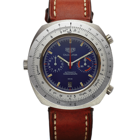 Three-body, polished and brushed, screwed-down case back, winding-crown at 9, chronograph buttons at 2 and 4, hooded lugs, revolving double bezel serving as slide rule to convert WEIGHT , volume and distance measurements. Navy blue with applied luminous steel baton indexes, outer 1/5th seconds scale, subsidiary dials for the 12-hour and 30-minute registers, aperture for the date. Luminous white baton hands. Cal. 12, gilt brass, 17 jewels, straight-line lever escapement, monometallic balance, shock absorber, self-compensating balance spring.