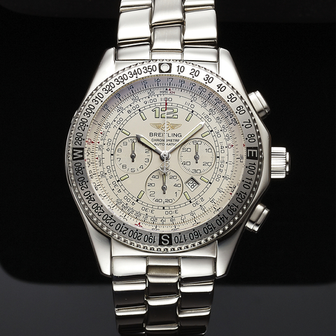 Three-body, polished, screw-down case back with embossed logo, bi-directional revolving bezel with 360-degree scale, sapphire crystal. Ivory-color with luminous baton indexes and Arabic 12; subsidiary dials for the seconds, the 12-hour and 30-minute registers, outer graduations for the minutes and the slide-rule, aperture for the date between 4 & 5. Luminous steel epee hands. Cal. 42, 38 jewels, monometallic balance, shock absorber, self-compensating flat balance spring.