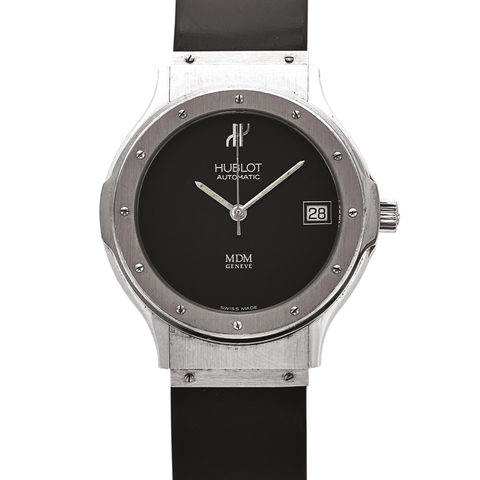 Three-body, solid, polished and brushed, screw-down crown, case back with six screws, hooded lugs, flat bezel with 12 screws as hour makers, sapphire crystal. Black, aperture for the date. Luminous steel baton hands. Cal based ETA 2892, rhodium plated, fausses cotes decoration, straight line lever escapement, monometallic balance, self-compensating flat balance spring, shock absorber, hack mechanism.Grading System: A