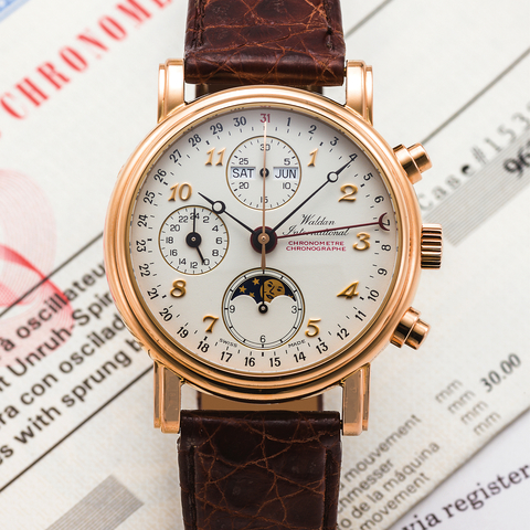 Two-body, solid, polished, stepped bezel and lugs, transparent screwed-down case back, sapphire crystals. Ivory colored with applied pink gold Breguet numerals, subsidiary dials for the seconds, the 12-hour and 30-minute registers and the 24 hours, outer graduation for the days of the month, apertures for the days of the week, the months and the moon phases. Blue painted Breguet hands. Cal. 7751, rhodium-plated, fausses cotes and oeil-de-perdrix decoration, 25 jewels, straight-line lever escapement, monometallic balance, shock absorber, self compensating flat balance spring, micrometer regulator, gold rotor.Grading System: A