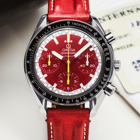 Three-body, polished and brushed, lyre lugs, black bezel with tachometer graduation to 500UPH, case back with "Speedmaster" embossed logo. Bi-color, red and white with luminous baton indexes, sunk subsidiary dials for the seconds, the 12-hour and 30-minute registers, outer minute/seconds and 1/5th seconds divisions. Luminous red and white baton hands. Cal. 1141, rhodium-plated, straight-line lever escapement, monometallic balance, shock absorber, self-compensating flat balance spring, hack mechanism.