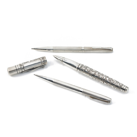 A special set of three writing instruments: 1) Viceroy Standard Victorian Roller Ball Pen. The barrel, cap, and fittings are made of 925 sterling silver with elaborate patterns engraved and the “Yard O Led” signed on the clip. 2) A box set of two writing instruments: a Deluxe 60 Lined ballpoint pen and a Deluxe 60 Lined mechanical pencil. Handcrafted in solid 925 sterling silver, both pieces showcase an engraved logo on the clip. Accompanied with original fitted box and instructions and blank guarantee paper.Grading System: A