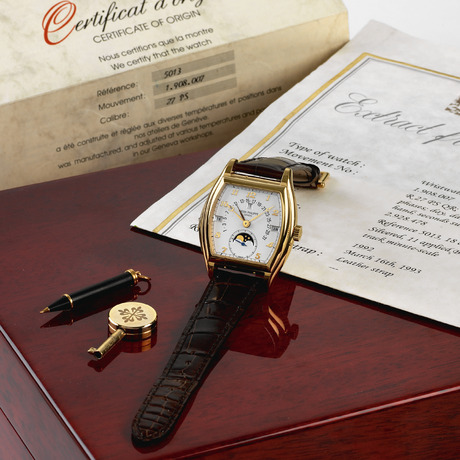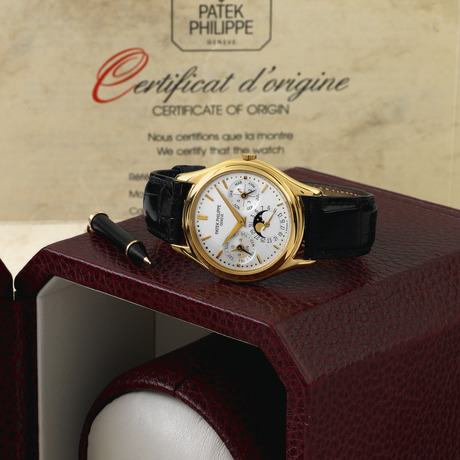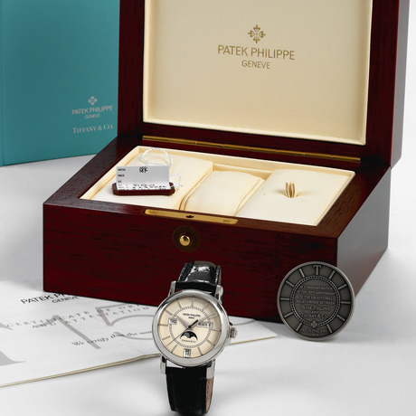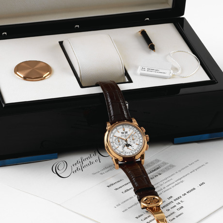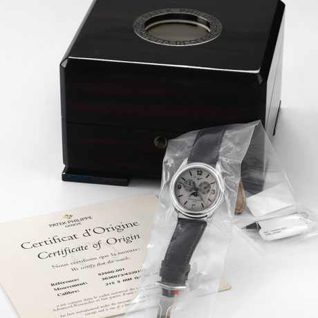 C. Two-body, polished, transparent screwed-down case back with cyclops lens over the escape wheel, curved bezel, correctors in the band, concave lugs, sapphire crystals. D. Brushed silver with applied black baton indexes and Arabic quarter-hour numerals, luminous dots, outer minute track, subsidiary dials for the days of the week, the months, aperture for the moon phases and the date at 6, powerreserve indication below 12. Luminous white gold feuille hands. M. Cal. 315/266, stamped with the Seal of Geneva quality mark, rhodium-plated, fausses cotes decoration, 36 jewels, straight-line lever escapement, silicon escape wheel, the bridge with additional milled opening, Gyromax balance adjusted to heat, cold, isochronism and 5 positions, shock absorber, self-compensating free-sprung flat balance spring, 21K gold rotor with zirconium ball-bearings. Dial, movement and case signed, back crystal inscribed: ?Patek Philippe Advanced Research.? Diam. 39 mm. Thickness 12 mm.