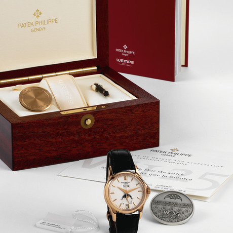 C. Three-body, solid, polished and brushed, screwed-down case back and crown, protected winding crown, concave lugs, sapphire crystal. D. Matte silver with applied pink gold baton indexes, subsidiary dial for the 24 hours, apertures for the date, the days of the week, the months and the moon phases. Pink gold dauphine hands. M. Cal. 315-203, stamped with the Seal of Geneva quality mark, rhodium-plated, fausses cotes decoration, 35 jewels, straight-line lever escapement, free-sprung Gyromax balance adjusted to heat, cold, isochronism and 5 positions, shock absorber, self-compensating flat balance spring, 21K gold rotor. Dial, case and movement signed, dial also signed "Wempe." Diam. 37 mm. Thickness 11 mm.