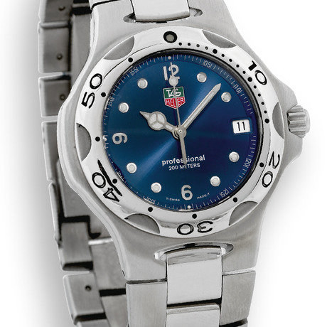 C. Two-body, polished and brushed, screwed-down back and crown with protection, graduated unidirectional revolving bezel, sapphire crystal. D. Blue with applied luminous round indexes and Arabic quarter hour numerals, outer minute/ seconds track with 5-minute/seconds Arabic markers, aperture for the date. Luminous steel skeleton hands. M. With quartz standardization. Dial, case and movement signed. Diam. 37 mm. Thickness 11 mm.