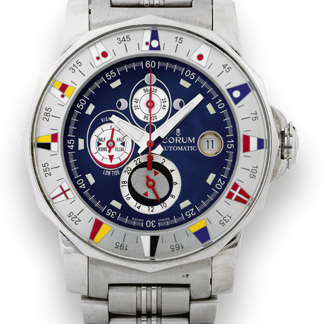 C. Three-body, solid, polished and brushed, transparent case back with 8 screws, ridged sides, steel bezel with polychrome nautical flags and graduation, protected screwed-down winding-crown, sapphire crystals. D. Black with applied luminous indexes, subsidiary dials for the low and high tide indication and the tide strength, the date and the moon phases, cyclops aperture for the date. Luminous steel dauphine hands. M. Cal. 2892, rhodium-plated, 21 jewels, straight-line lever escapement, monometallic balance, shock absorber, self-compensating flat balance spring, rotor with multi-colored enamel inlay. Dial, case and movement signed. Diam. 44 mm. Thickness 15 mm.
