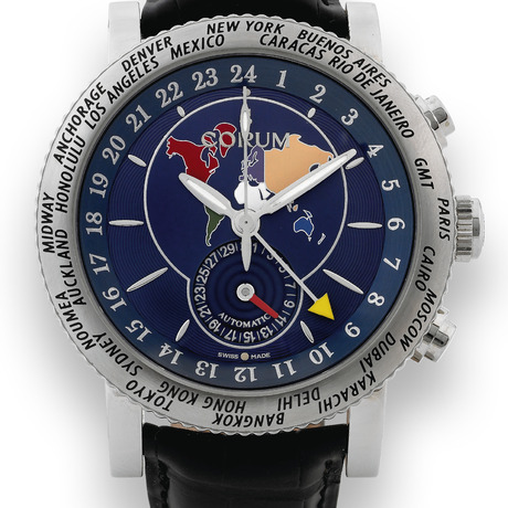 C. Three-body, solid, polished and brushed, transparent case back with 8 screws, ridged sides, revolving steel bezel bearing names of 24 world locations, the push-buttons are to independently set the hour hand in one hour increments for the second time zone, sapphire crystals. D. Guilloche midnight blue with applied steel indexes, subsidiary silver ring dial for the date, outer graduation in 24 hours for the second time zone, concentric multicolored polychrome enameled word map. Luminous steel baton hands, yellow arrow for the GMT time. M. Cal. 2892A2, rhodium-plated, 21 jewels, straight-line lever escapement, monometallic balance, shock absorber, self-compensating flat balance spring, rotor with enamel inlay. Dial, case and movement signed. Diam. 44 mm. Thickness 13 mm
