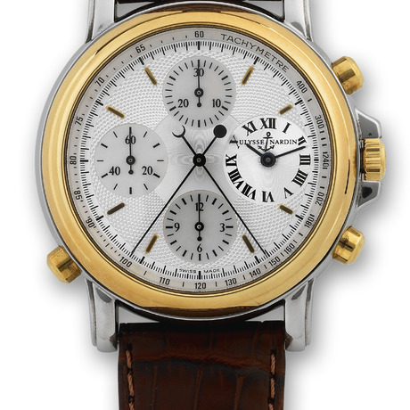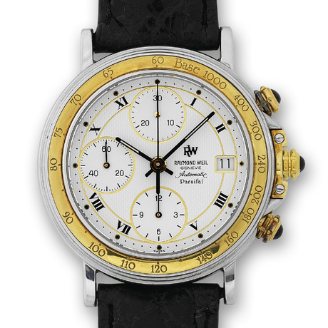 C. Two-body, polished, reverse secured by four screws, stepped bezel to gold-plated tachometer scale, cabochon-set crown and chronograph buttons, straight lugs, sapphire crystal. D. Textured white with Roman numerals and outer dot indexes, gold-rimmed subsidiary dials for seconds, 30-minute and 12-hour registers, date aperture. Black-coated luminous baton hands. M. Cal. 7750, rhodium-plated 17 jewel movement with lever escapement, shock protection, index regulator and selfcompensating flat balance spring. Dial, case and movement signed. Diam. 38 mm.