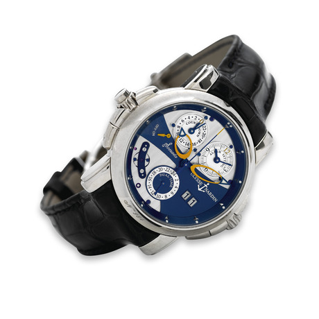 C. Three-body, solid, polished, concave lugs, transparent case back with commemorative inscription: ?Gübelin - 1854-2004,? sapphire crystals. The pusher at 8 advances the second time zone hand forward in 1-hour increments, the one at 10 moves it backward. D. Two-tone blue with applied and faceted white gold baton indexes, subsidiary dials for the seconds at 6 and the 24 hours of the second time zone at 12. White gold baton hands, matte hand for the second time zone. M. Cal. 215/156, stamped with the Seal of Geneva quality mark, rhodium-plated, fausses cotes decoration, 18 jewels, straight-line lever escapement, Gyromax balance adjusted to isochronism and 5 positions, shock absorber, self-compensating free-sprung flat balance spring. Dial, case and movement signed, dial and case also signed for Gübelin. Diam. 37 mm. Thickness 10 mm.