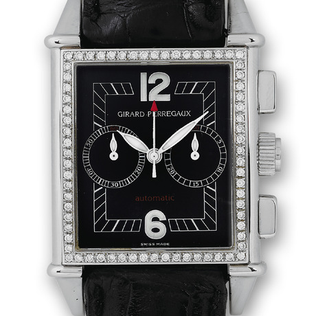 C. Two-body, polished, triangular lapidated lugs, sapphire crystal with diamond-set (70 total) bezel. D. Black with painted Arabic luminous numerals, subsidiary seconds and 30-minute register dial. White luminous feuille hands. M. Cal. 3080, rhodium-plated, fausses cotes and oeil-de-perdrix decoration, 38 jewels, straight line lever escapement, monometallic balance, shock-absorber, self compensating flat balance-spring, micrometer regulator. Dial, case and movement signed. Dim. 30 x 47 mm. Thickness 13 mm.