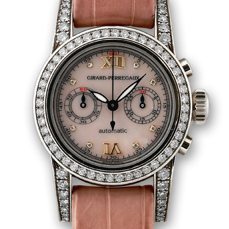 C. Three-body, polished, transparent case back with 5 screws, bezel set with 49 round diamonds, elongated lugs set with a total of 28 graduated round diamonds, domed sapphire crystal. D. Pink, mother of pearl with applied 8 gold and diamond-set indexes, luminous yellow gold Roman 12 and 6, subsidiary dials for the seconds and 30-minute register. Luminous blued steel feuille hands. M. Cal. 3080, rhodium-plated, fausses cotes and oeil-de-perdrix decoration, 38 jewels, straight-line lever escapement, monometallic balance, shock absorber, self-compensating flat balance spring, 18K gold rotor. Dial, case and movement signed. Diam. 32 mm. Thickness 12 mm.