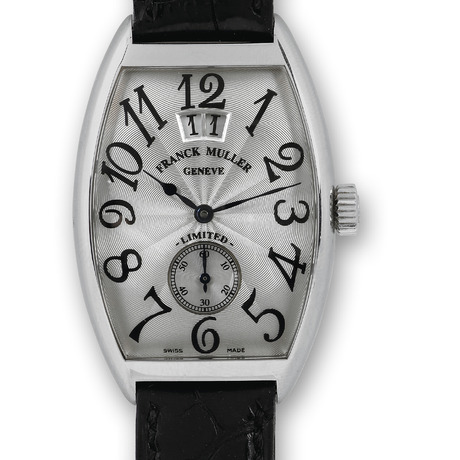 C. Two-body, polished and brushed, case back with 4 screws and engraved ?Limited,? domed sapphire crystal. D. Guilloché silver with sunray pattern, painted radial Arabic numerals, double aperture for large date, subsidiary seconds dial. Blued steel double spade hands. M. Cal. 2800, rhodium-plated, fausses cotes decoration, 21 jewels, straight-line lever escapement, monometallic balance adjusted to 8 positions, shock absorber, self compensating flat balance spring, solid platinum rotor. Dial, case and movement signed. Dim. 30 x 45 mm. Thickness 11 mm.