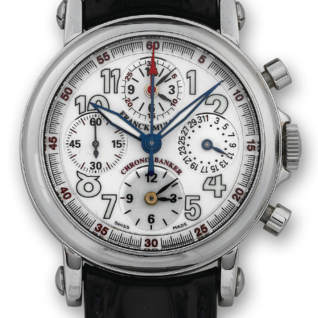 C. Three-body, polished, rounded bezel, straight lugs, domed sapphire crystal. D. White with luminous Arabic numerals, sunk subsidiary guilloché dials for the 30-minute register, 2 additional individually adjustable time zones, the date and the seconds, outer 1/5th seconds / minutes graduation. Blued steel luminous lozenge hands. M. Cal. FM 7000, rhodium-plated, fausses cotes decoration, 26 jewels, straight-line lever escapement, monometallic balance adjusted to 8 positions, shock absorber, selfcompensating flat balance spring, platinum rotor. Dial, case and movement signed. Diam. 39 mm. Thickness 13 mm.