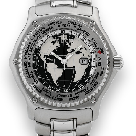 C. Three-body, polished and brushed, reverse secured by 8 screws, screw-down crown, bi-directional revolving bezel bearing the names of 23 world cities. D. Black and silver, representing the five Continents: Europe, North and South America, Asia, Africa and Australia, outer revolving ring dial for the diurnal and nocturnal hours, aperture for the date. Tritium-coated stainless steel baton hands. M. Cal. 124, rhodium-plated, fausses cotes and oeil-de-perdrix decoration, 21 jewels, straight line lever escapement, monometallic balance, shock-absorber, selfcompensating flat balance spring. Diam. 38 mm.