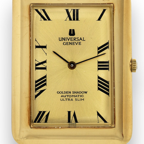 C. Two-body, solid, polished, rounded bezel, hooded lugs, flattop crystal. D. Champagne with printed Roman numerals. Yellow gold and black baton hands. M. Cal. 2-66, rhodium-plated, 25 jewels, straight-line lever escapement, monometallic balance, shock absorber, self-compensating flat balance spring. Dial, case and movement signed. Dim. 30 x 40 mm. Thickness 6 mm.