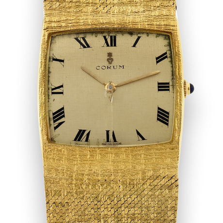 C. Two-body, solid, textured bezel continuing the bracelet decoration, cabochon sapphire-set winding-crown. D. Linen-textured champagne with printed radial Roman numerals. Yellow gold baton hands. M. Cal. 7000, rhodium-plated, 21 jewels, straightline lever escapement, monometallic balance adjusted to 3 positions, self-compensating flat balance spring. Dial, case and movement signed. Dim. 32 x 35 mm. Thickness 7 mm. Approx. overall length 195 mm.