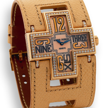 C. Two-body, solid, polished and brushed, case back with 8 screws, stepped bezel set with 92 brilliant-cut diamonds, sides set with a total of 92 brilliant-cut diamonds, straight lugs set with 12 round brilliant-cut diamonds, gold screwed bars, sapphire crystal. D. Guilloché copper-color with applied radial Arabic numerals for the quarter hours, three, six and nine spelled out, concentric minute track. Blued steel feuille hands. M. With quartz standardization. Dial, case and movement signed. Dim. 39 x 39 mm. Thickness 8 mm.