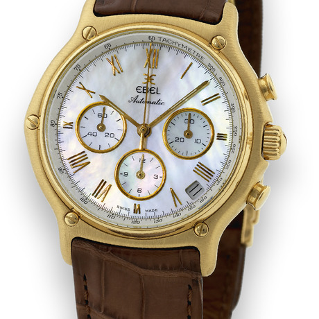 C. Three-body, polished and brushed, bezel fixed with 5 yellow gold screws, protected winding-crown, sapphire crystal. D. Mother-of-pearl with applied radial yellow gold Roman numerals, subsidiary gold ring dials for the seconds, the 12-hour and 30-minute registers, outer 1/5th second and tachometer scales, aperture for the date between 4 and 5. Luminous gold baton hands. M. Cal. 080, rhodium-plated, fausses cotes decoration, 25 jewels, straight-line lever escapement, monometallic balance, shock absorber, self-compensating flat balance spring. Dial, case and movement signed. Diam. 39 mm. Thickness 11 mm.