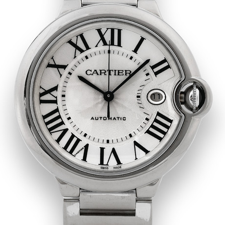 C. Three-body, polished and brushed, rounded bezel, case back with 8 screws, cabochon sapphire set winding crown protected within an oval cage, sapphire crystal. D. Guilloché silver with painted radial Roman numerals on a plain reserve, Cartier secret signature on the VII, inner minute track, aperture for the date. Blued steel épée hands. M. Cal. 049, rhodium-plated, straightline lever escapement, monometallic balance, self-compensating flat balance spring, shock absorber, hack mechanism. Dial, case and movement signed. Diam. 42 mm. Thickness 13 mm. Approx. overall length 195 mm.