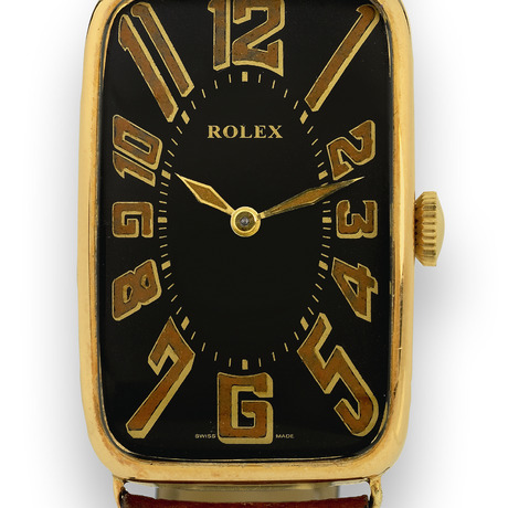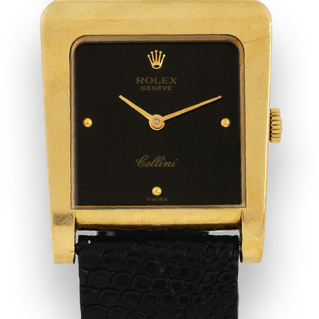 C. Two-body, solid, shaped, polished and brushed, hooded lugs on the 12, curly lugs on the 6. D. Black with applied gold round indexes. Yellow gold baton hands. M. Cal. 1600, rhodiumplated, 19 jewels, straight-line lever escapement, monometallic balance, shock-absorber, self-compensating flat balance spring. Dial, case and movement signed. Dim. 25 x 23 x 29 mm. Thickness 6 mm.