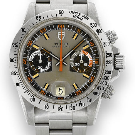 C. Three-body, polished and brushed, screwed-down engraved case back, crown and buttons, tachometer graduation on the steel bezel to 500 units per hour, Twinlock winding crown protected by the crown guard, crystal with cyclops lens. D. Bicolor anthracite and black with luminous baton indexes, outer 1/5th seconds scale with 5 minute/second red Arabic markers, subsidiary dials for the seconds and the 45-minute register, aperture for the date at 6. Luminous steel baton hands, red chronograph hand. M. Cal. 234, rhodium-plated, 17 jewels, straight-line lever escapement, monometallic balance, shock absorber, self-compensating flat balance spring. Dial, case and movement signed. Diam. 40 mm. Thickness 13 mm.