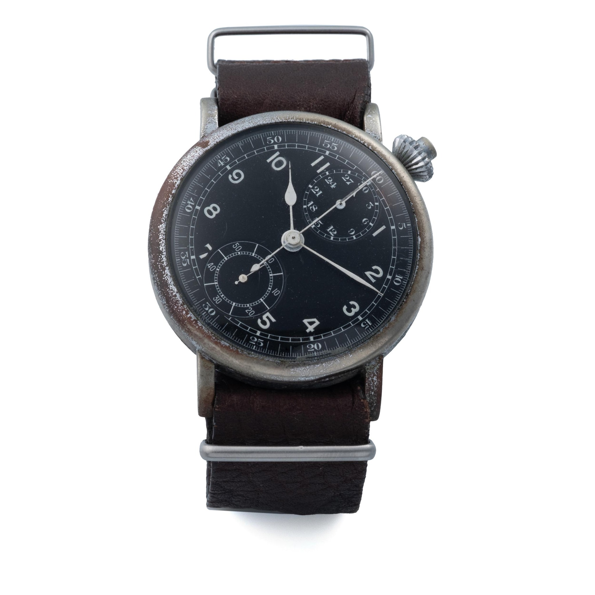 A fine and rare, unusual, large, chrome, manual wind since button chronograph wristwatch delivered to the US Army