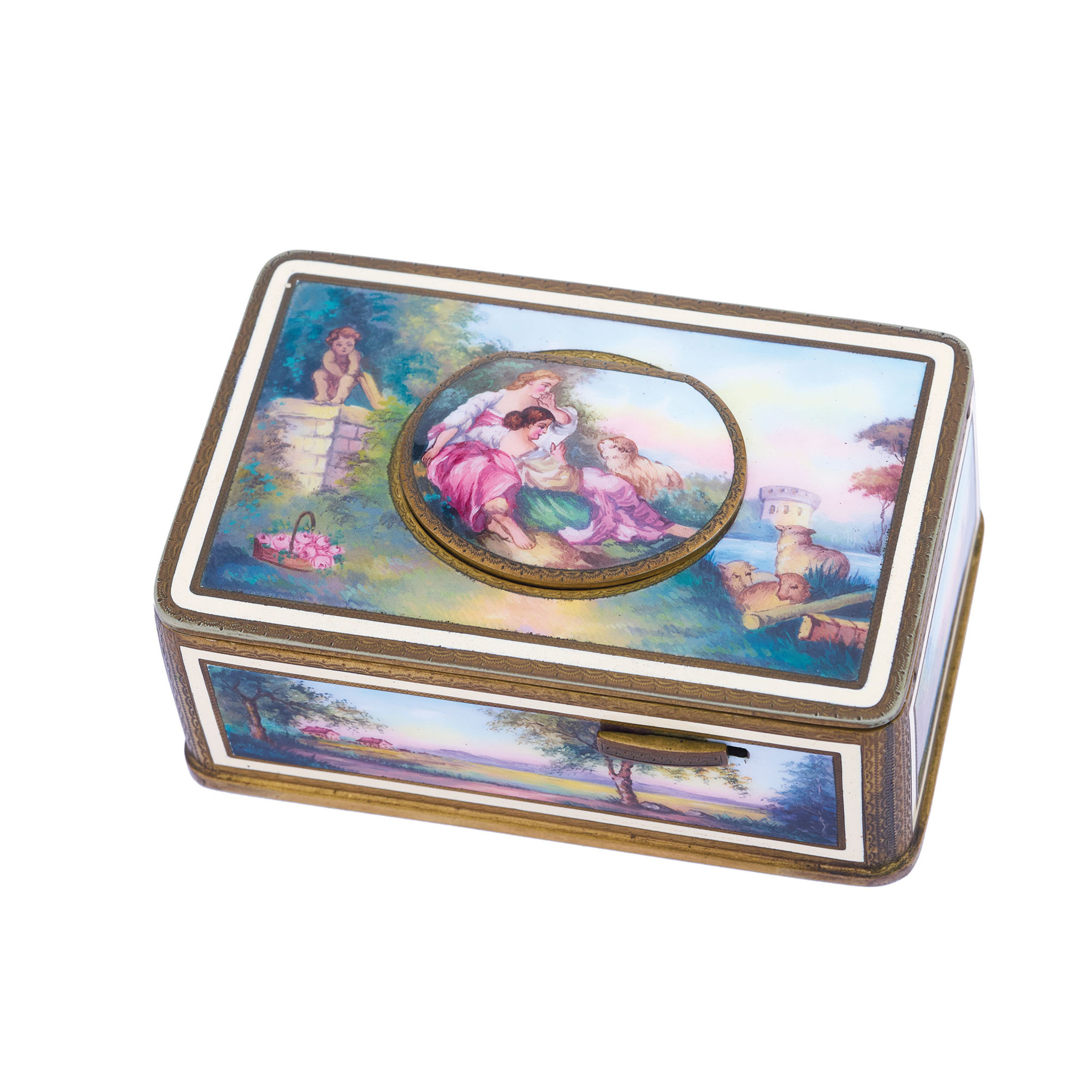A fine and attractive gilt-metal singing bird box with painted enamel. It features a two-part rectangular case with engraved rounded corners and serpentine sides, decorated with rural alpine river scenes. The bird cover shows ladies among sheep, continuing onto the top panel. Inside, a rectangular brass barrel and bellows operate a revolving bird with moving wings and beak, controlled by two cams beneath the barrel wheel. The gilt brass grille is pierced and engraved with foliage.