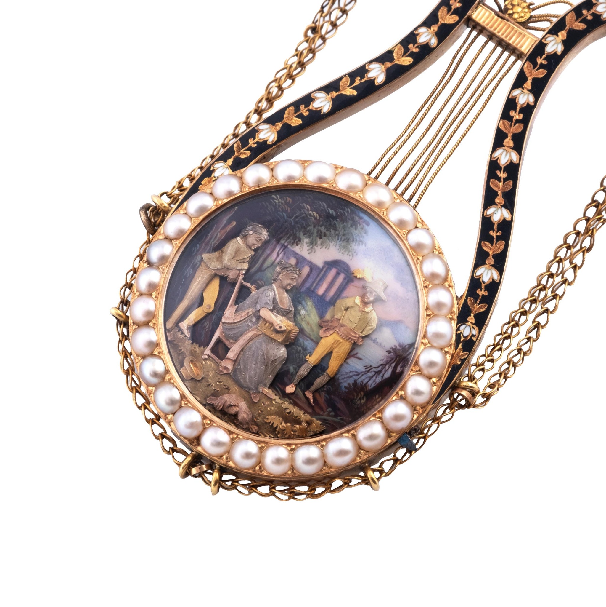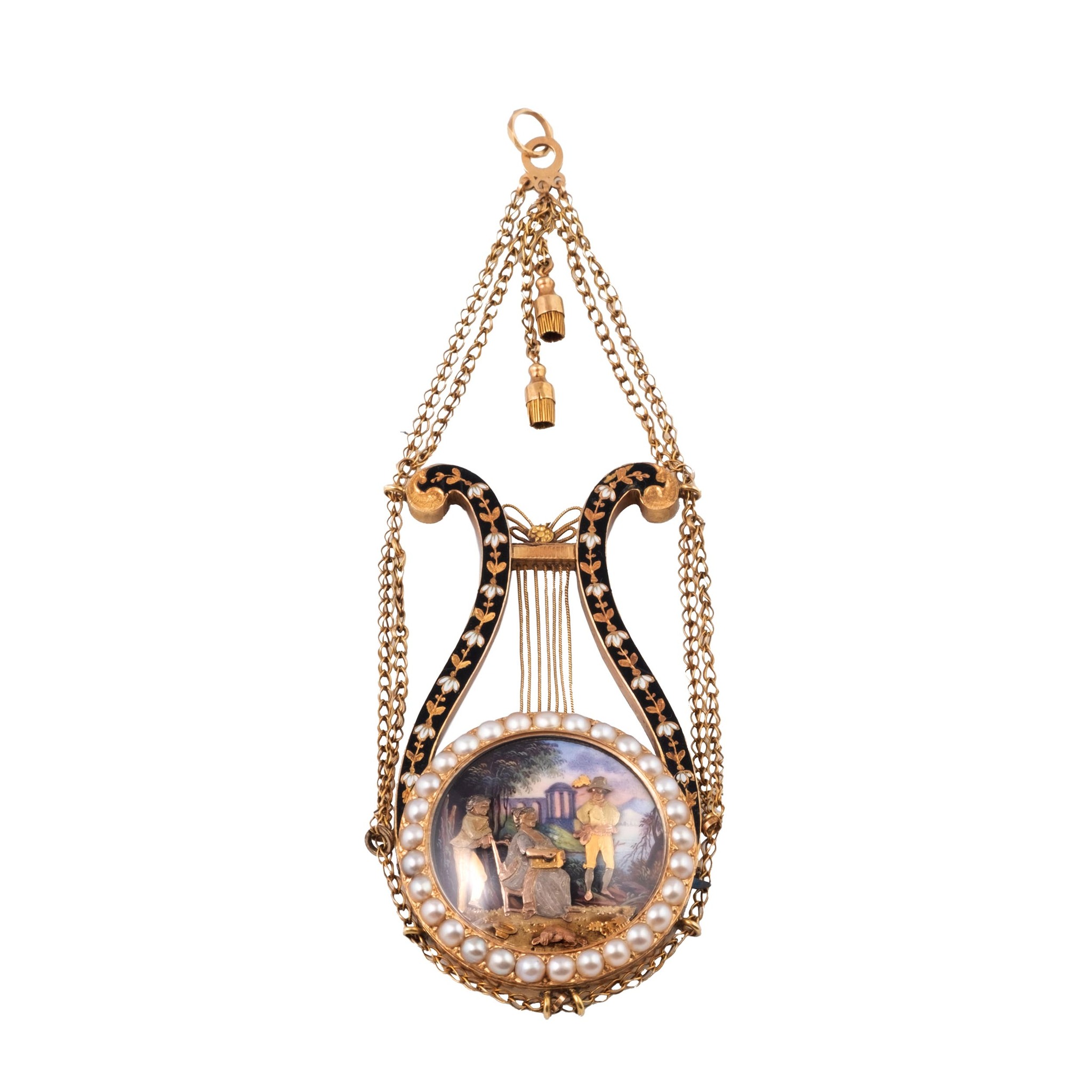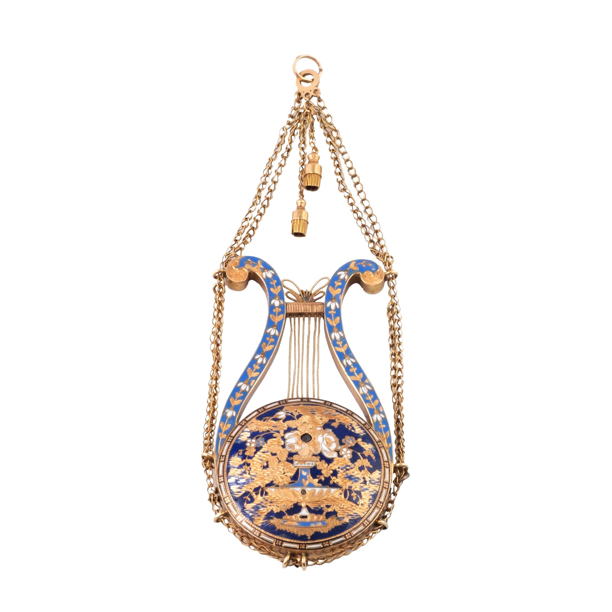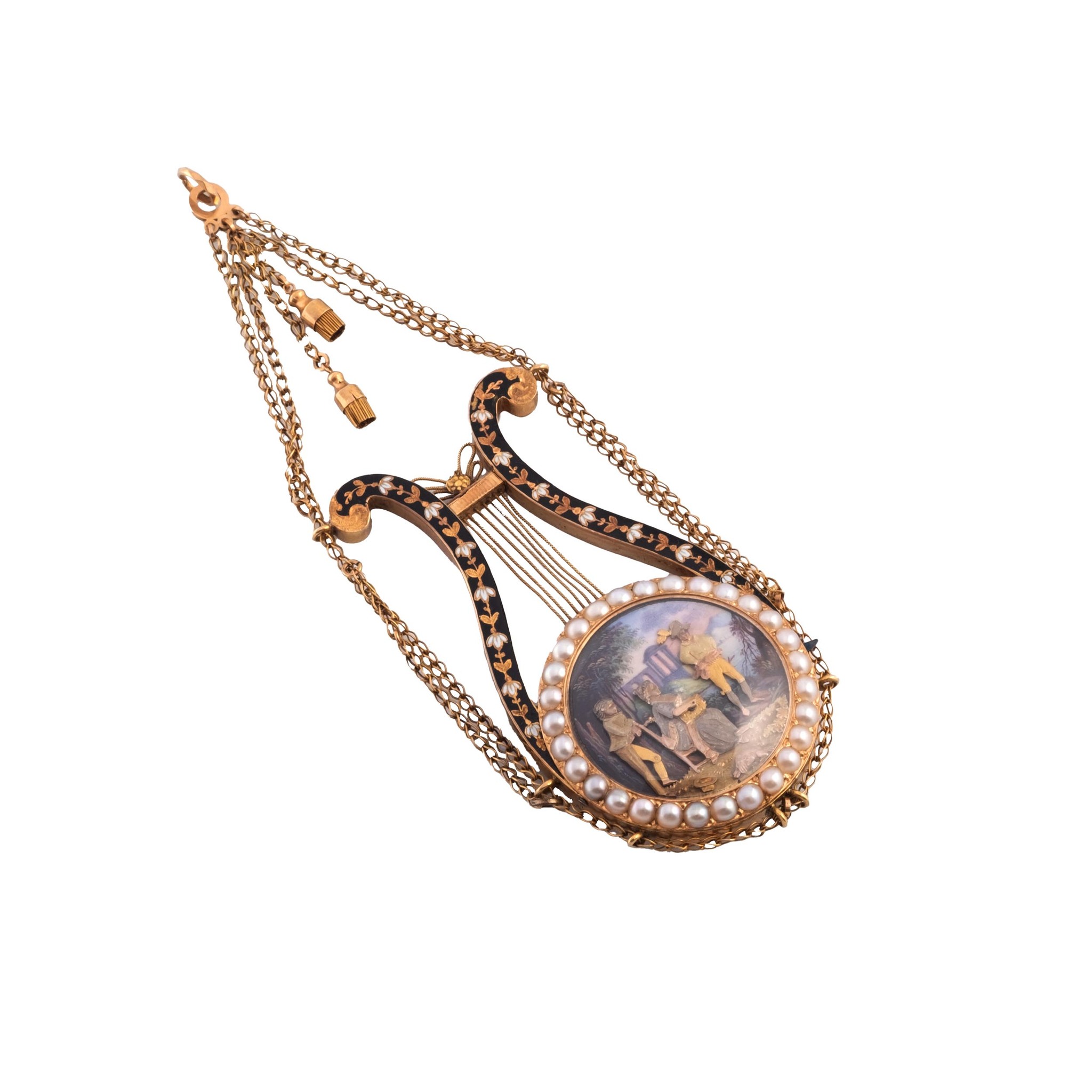 A very fine and very rare, 18k gold, manual wind musical, painted on enamel and pearl-set lyre-form pendant with automaton with two animations. One side of the sound-board decorated with a vase of gold and white flowers against a blue background, the winding aperture in one of the petals, the horns in a floral and foliate pattern against matching blue enamel, suspended from a double gold chain. Automaton: the figures in multicolored gold over polychrome enamel with a rural landscape and ruins in the background; a seated lady plays the hurdy-gurdy, a boy behind her taps his foot, a man dances to the music.