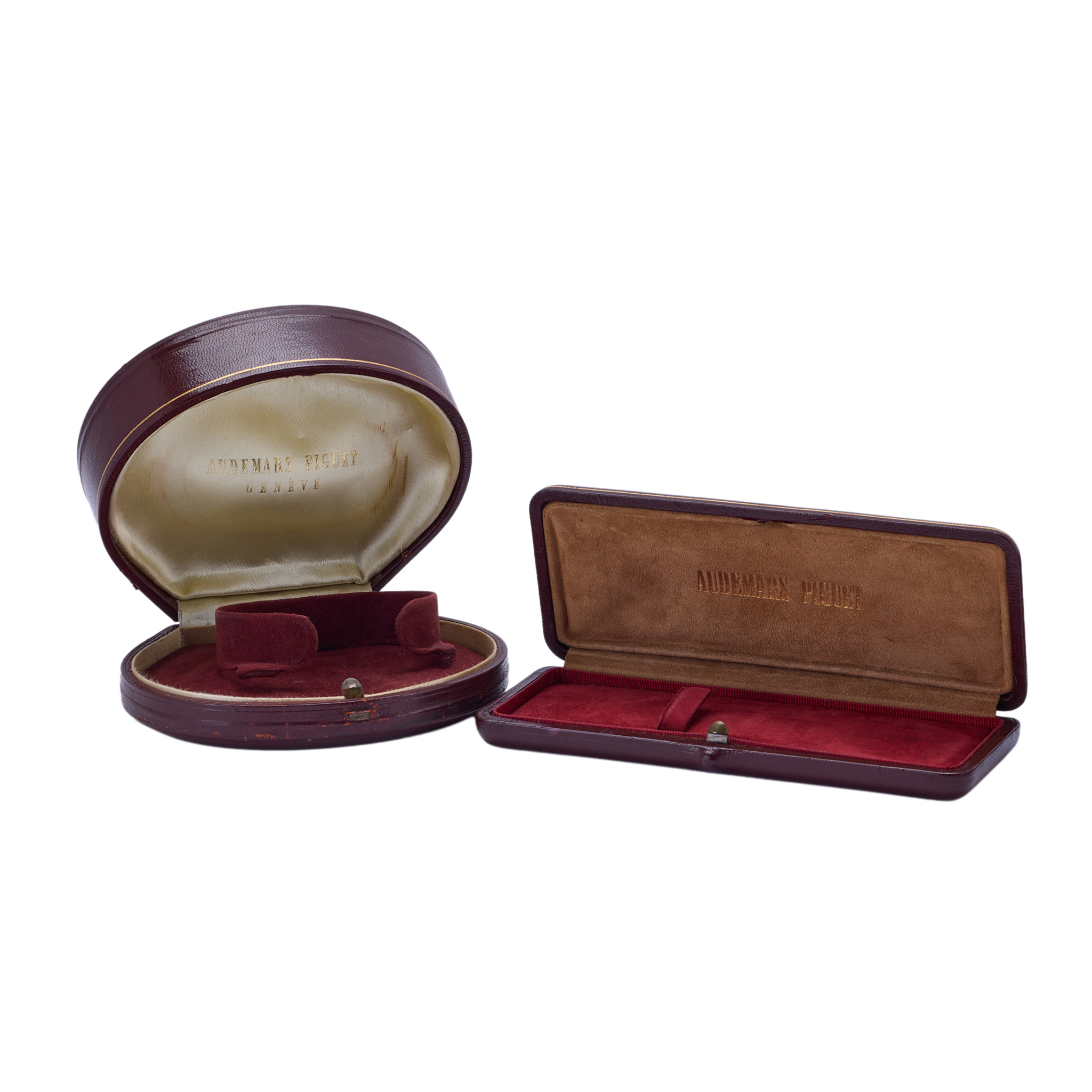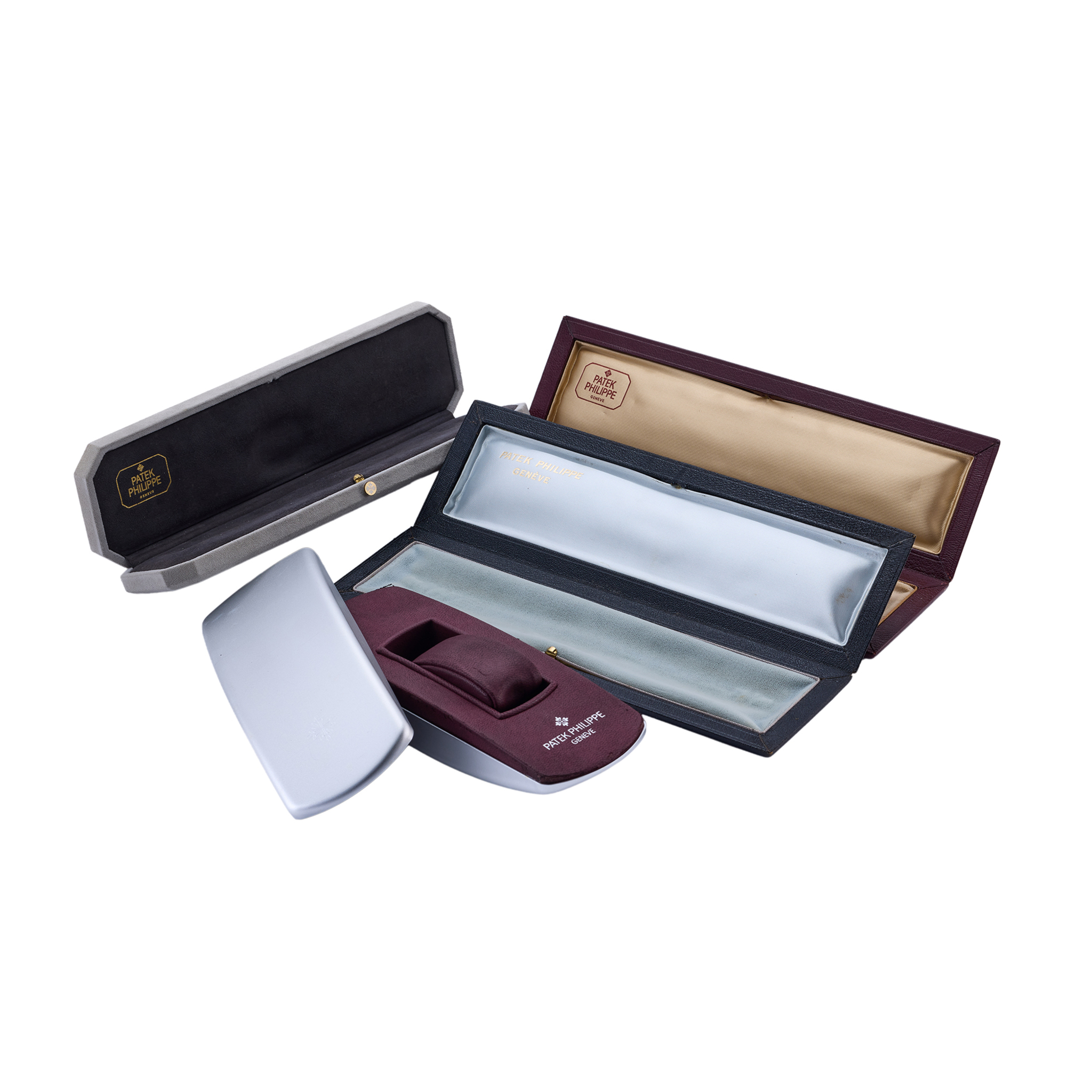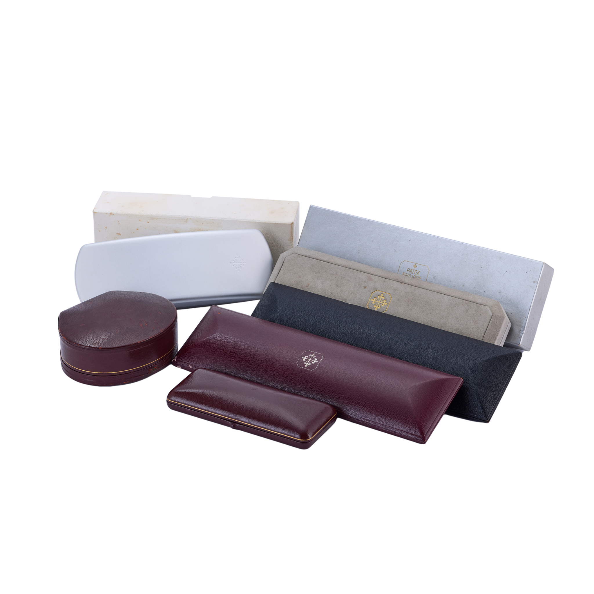 A fine and rare, a set of six vintage wristwatch boxes audemars piguet burgundy colour, rectangular leather wristwatch box audemars piguet burgundy colour, shell-shaped leather wristwatch box patek philippe grey colour, rectangular suede wristwatch box with silver colour outer box patek philippe silver colour, rectangular metal wristwatch box with ivory colour outer box patek philippe black colour, rectangular pvc wristwatch box patek philippe burgundy colour, rectangular leather wristwatch box