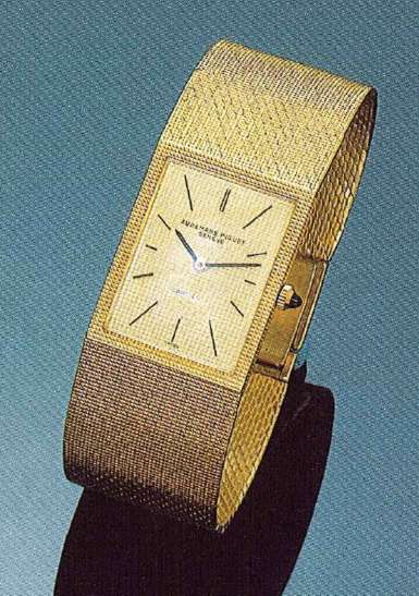 Audemars Piguet, Geneve, No. 107015, case No. 42906, made for Cartier in 1968. Very fine and rare, extra-flat, rectangular, 18K yellow gold gentleman's wristwatch with 18K "guilloche" gold integrated bracelet.