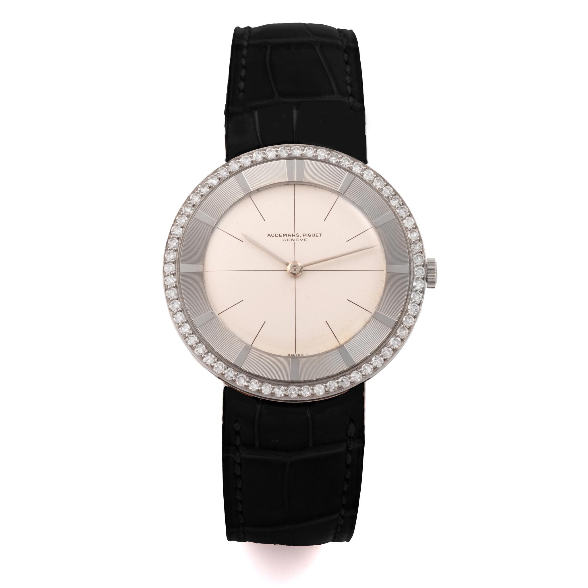 An exceptional, as new, 18k white gold, manual wind wristwatch with diamond bezel