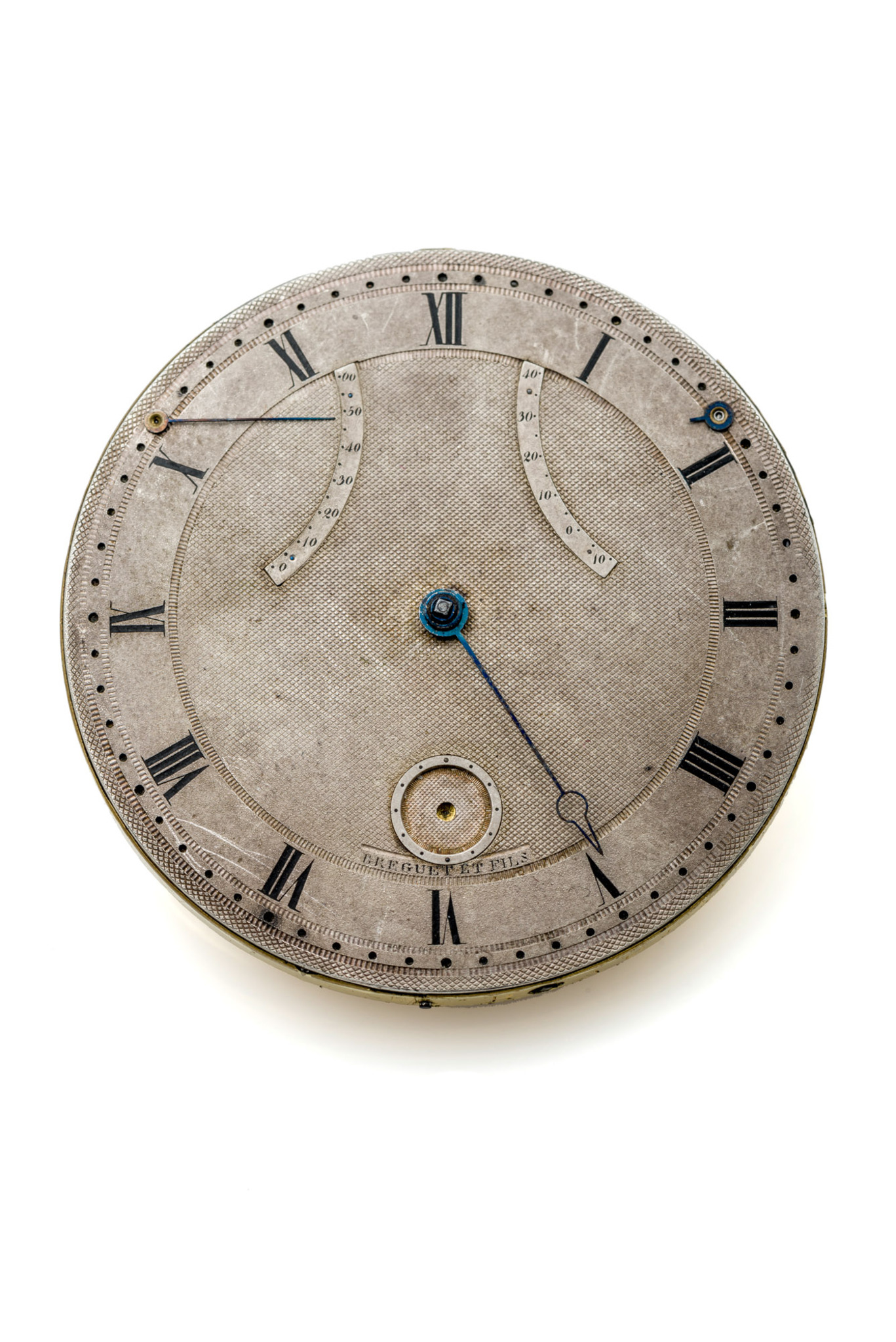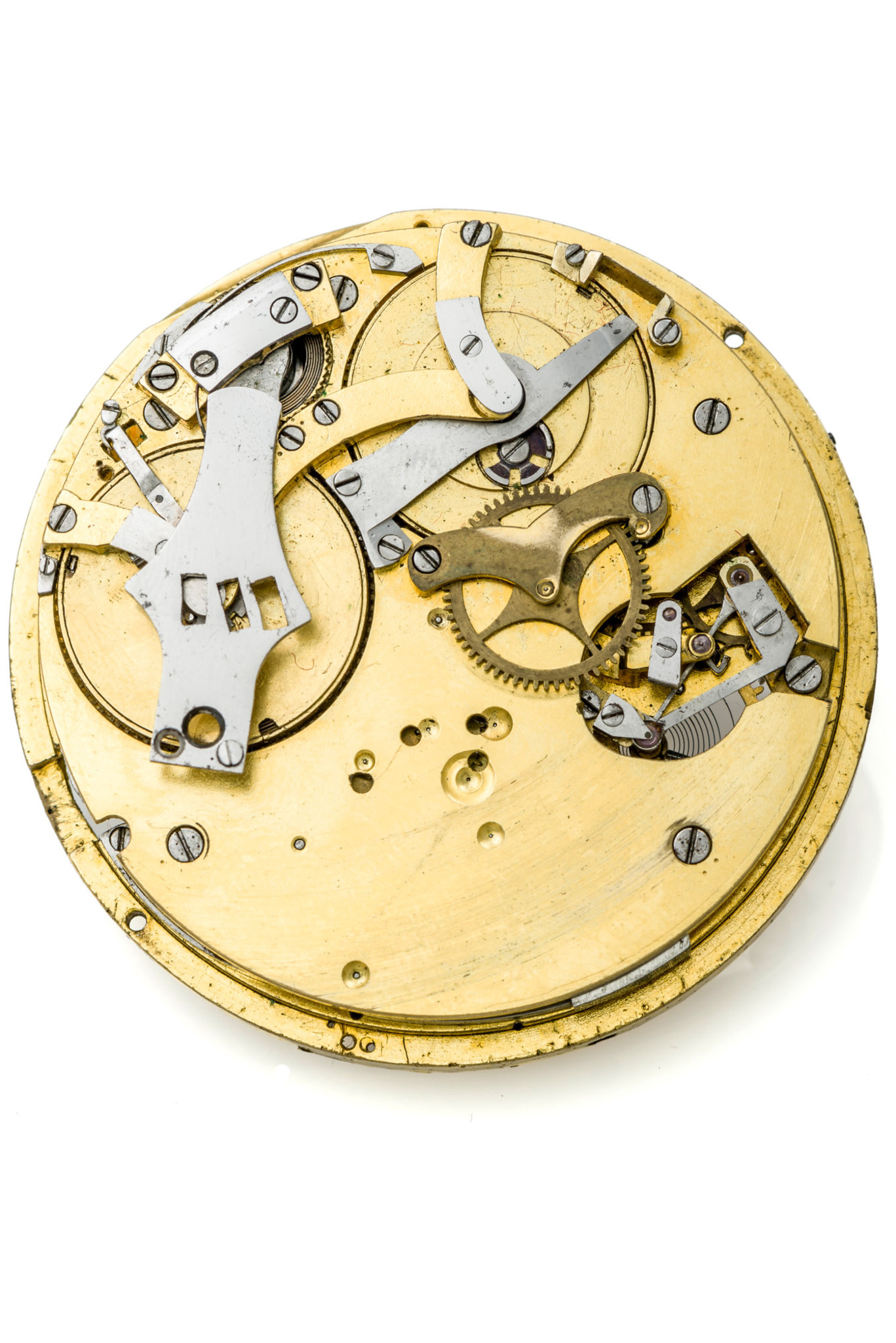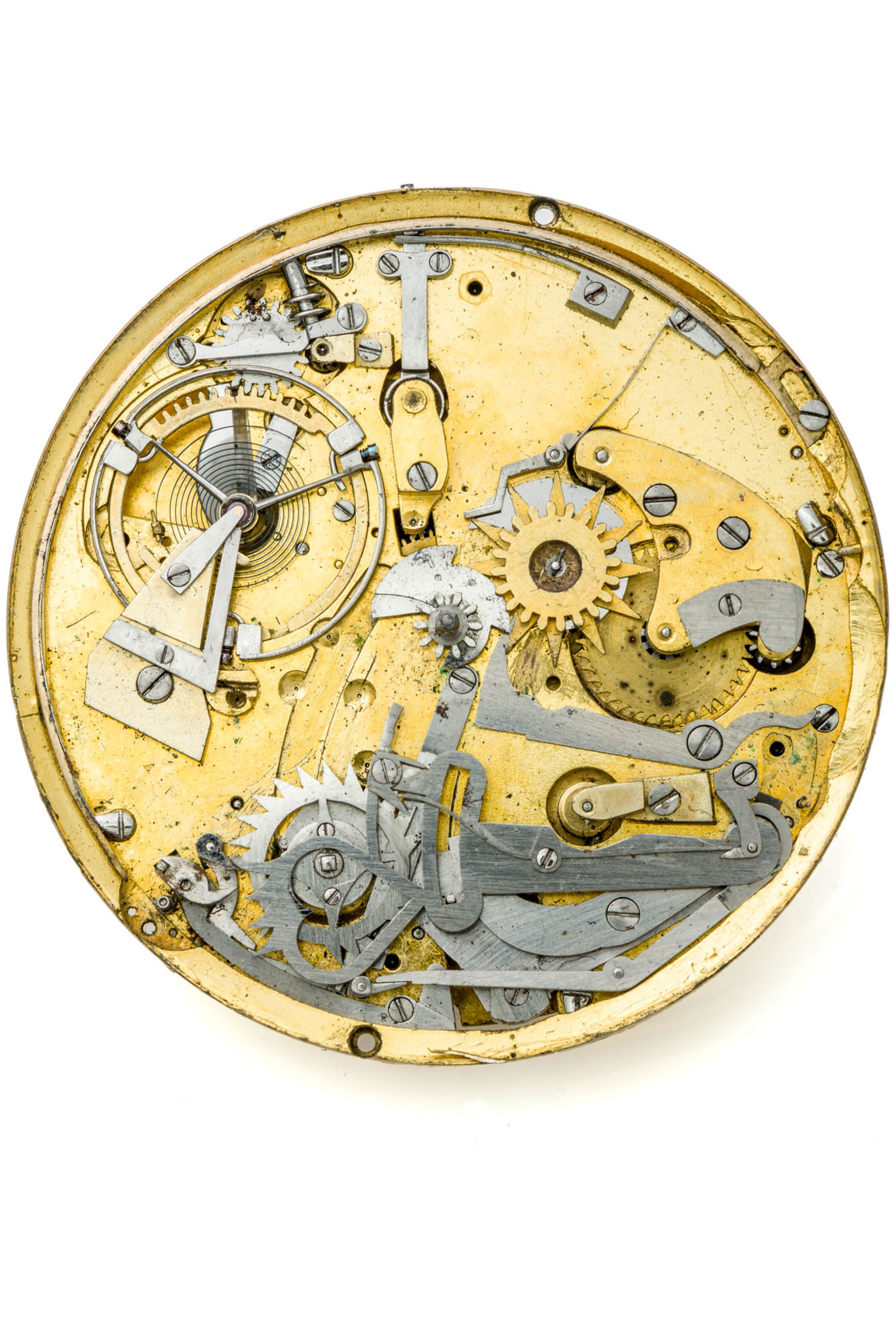The movement of this watch, partially incomplete, No. 42 of Abraham Louis Breguet, is mentioned by him as being completed in August 1786. This watch is therefore one of the first self-winding movements, so called 'Perpetual of the history of watchmaking', that made the reputation of Breguet. These watches are very much sought after by collectors and are well documented by George Daniels, Emmanuel Breguet and Jean Claude Sabrier. The movement presented here has two barrels. In the evolution of the self-winding movement, this improvement that seems to be credited to Breguet, allowed him to obtain a better mechanical efficiency of his timepieces: the division of the strength of the oscillating mass on two barrels helped to reduce the wear of the mechanism which was a big issue in early timepieces. In the Breguet archives, 2 watches bearing No. 42 appear in their "livre d'etablissement" that contains part of the first 220 watches made by the firm. The information is mainly concerning those made between 1787 and 1792, a period marked by the French revolution that pushed Abraham Louis to exile himself to Switzerland. In this register it states '7-42, perpetual calendar with repeating with free escapement, April 30th 1787, case No. 2467'. This implies that this self-winding watch with quarter-repeating, bearing the number 42 was reconstructed based upon the watch No. 7. It was sold in 1787 probably bearing the case number 2 467. Not long after, one can find another number 42, repeating watch with virgule escapement sold to Monsieur Noisseuly 4th June 92, 1000 tt. In the first sales book of Breguet, one can find further interesting information about these pieces. One can notice under watch No. 42, a repeating watch on gongs and the mention of the 'watch No. 42. perpetual calendar repeating pocket watch with thermometer and silver dial', this watch was clearly made here, but we have no traces in our books; the watch seems to have been made in 1786 and a certificate of origin was made in June 1856. It was sold to Recordon London in 1795 for 700 F. In Breguet's production it is not the first time that a watch was found bearing the same case number such as this example for number 42. One of the 2 watches, there is the repeating watch sold to Recordon for the amount of 700F and the other, a self-winding quarter-repeating with silver dial, a 60-hour power reserve and thermometer which is the movement being offered here. The original case as well as the oscillating masses (probably made of gold) having been lost over the years are no longer present. The dial on our movement is made of silver and bears on the reverse the number 651 and the letter R. This type of watch was then sold by Breguet for amounts varying between 2'000 and 4'000 francs at the HEIGHT of his pre-revolutionary production. The dial is signed Breguet & Fils, meaning that the watch was probably transformed by Breguet circa 1810-1830, which was often the case at the time (when watches were often modernised by the firm, originally this watch would have been born with an enamel dial). A rare opportunity to acquire one of the first ever-made self-winding movements made by Abraham Louis Breguet.